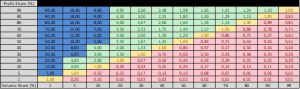 This method based on the Table 1 below is the ratio between Value Share and Volume Share, in percentages. There is an equivalent line where this ratio is one. This means that you do not have pricing power, but your competition is about at the same level as you. On the other hand, if you find yourself in the “red zone” of the table, this means that your competition has pricing power and you are probably just a pricing follower.