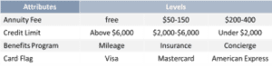 In order to select the attributes to be analyzed, best practices suggest in-depth interviews with the client’s management team or professionals from the industry in question. Going back to the credit card example which discusses consumer preferences when purchasing a card, we could raise a number of attributes, such as: a) annuity fee; b) card´s interest rates; c) credit limit; d) benefits program; e) card flag; f) card´s premium level; g) call center; h) card acceptability; i) ties with philanthropic institutions, among others. These attributes may have more than two levels of response, as is the case with the benefits program, which may be a Mileage Program, Insurance Coverage, Concierge, among others. However, literature references suggest choosing at most between six and seven attributes. Above this number, it is difficult to keep the respondent motivated to answer the survey as it becomes lengthy and complex, a matter further discussed in more detail in the following topic. The researcher should also avoid inaccurate or subjective criteria for defining the levels of each attribute, such as low, medium and high. For instance, a low annuity for one respondent may be an average annuity for another.