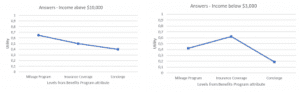 Results show that respondents with an income below $3,000 perceive insurance coverage as more valuable than a mileage program and concierge. For a wealthier respondent, the mileage program becomes more relevant. In both cases, the concierge attribute has the least relevance in decision making.