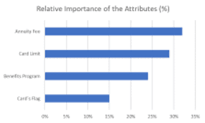 The following chart is also one of Conjoint’s results and shows the relative importance of each attribute. In this hypothetical example, we highlight the importance of each attribute when purchasing a credit card.