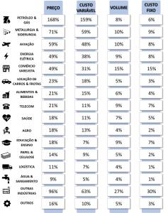 Na tabela é possível ver que alguns segmentos são extremamente sensíveis a ações de aumentos de preço ou reduções dos custos variáveis devido às pequenas margens praticadas nos negócios. Também é possível identificar alguns segmentos que a força de Pricing é ainda mais intensa proporcionalmente do que a redução dos custos variáveis, como é possível notar para os segmentos de Educação & Ensino e Telecom.